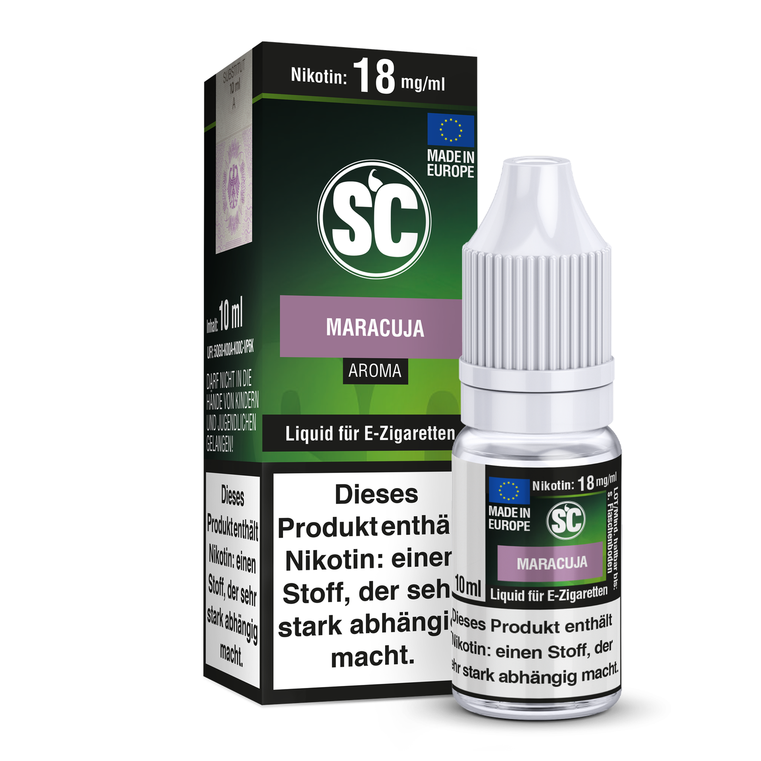 Mit jeder SC Liquid Flasche, erhalten Sie 10 ml Liquid von dem gewählten Liquid Aroma und der gewählten Stärke. Ihnen stehen insgesamt 5 Stärken mit und ohne Nikotin zu Auswahl. Das SC Maracuja E-Zigaretten Liquid schmeckt beim Dampfen nach Maracuja.