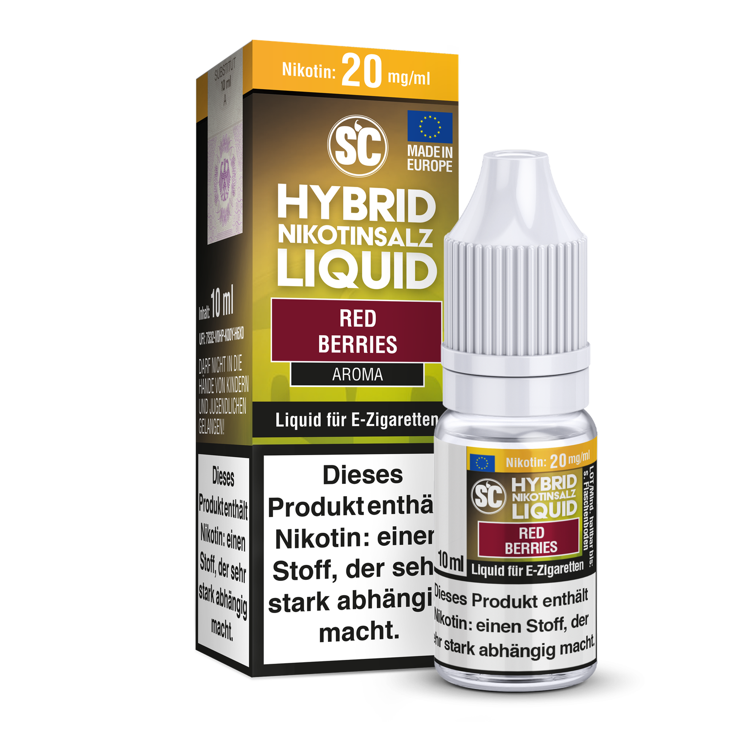 Das SC Hybrid-Nikotinsalz Liquid Red Berries wird Ihnen in einer 10 ml Flasche geliefert. Sie haben die Wahl zwischen den Nikotinstärken 5 mg/ml, 10 mg/ml und 20 mg/ml. Es setzt sich aus den Nikotinsalzen Nikotinbenzoat und Nikotinmalat zusammen. Hinzu kommt dann noch das herkömliche Nikotin, welches auch in normalen E-Zigaretten Liquids enthalten. Daher kommt auch der Name "Hybrid". Beim Dampfen in einer E-Zigarette entsteht der Geschmack von verschiedenen roten Früchten.